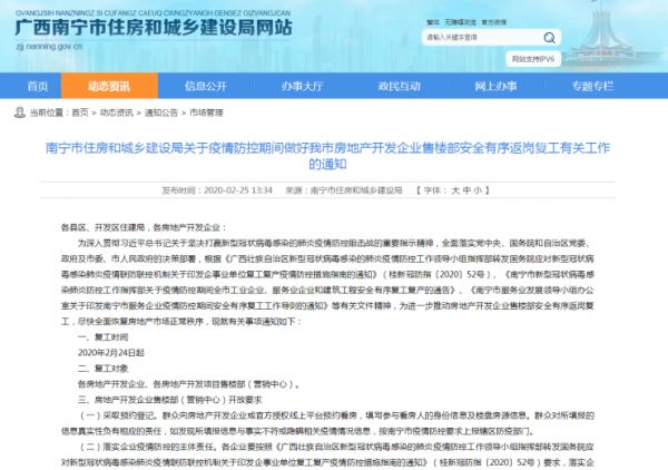 2月24日,南宁住建局发布了防控期间南宁市房地产开发企业售楼部安全有序返岗复工的相关工作通知。