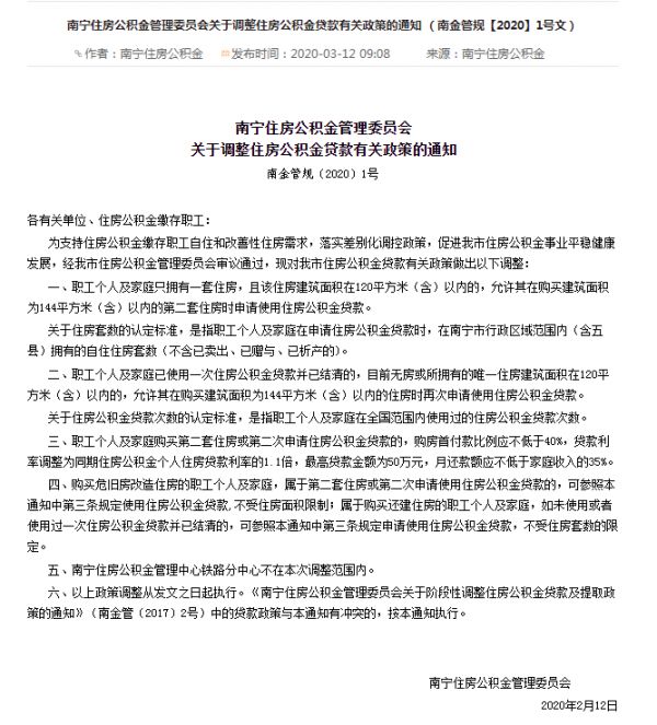 2月23日,南宁住房公积金管理委员对我市住房公积金贷款有关政策作调整,其中,职工个人及家庭只拥有一套住房,且该住房建筑面积在120平方米(含)以内的,允许其在购买建筑面积为144平方米(含)以内的第二套住房时申请使用住房公积金贷款。