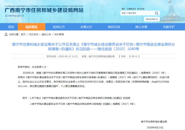 4月23日,南宁市住房和城乡建设局发布了关于公开征求废止《南宁市城乡建设委员会关于印发<南宁市商品住房全装修分级指南>的通知》意见的函,引发社会各界的广泛关注。
