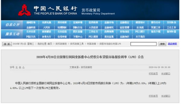 4月20日,中国人民银行授权全国银行间同业拆借中心公布,1年期LPR为3.85%,5年期以上LPR为4.65%,分别较上一期下调20个和10个基点。这是自去年8月LPR改革以来,降幅最大的一次。