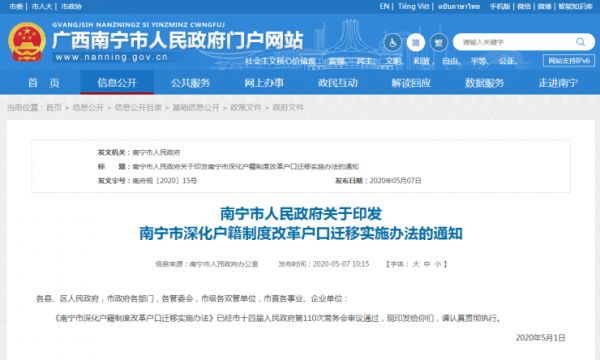 2020年6月1日起,南宁市人民政府印发的《南宁市深化户籍制度改革户口迁移实施办法》,大幅放宽了各种落户条件,被称为是南宁史上最低门槛落户政策。