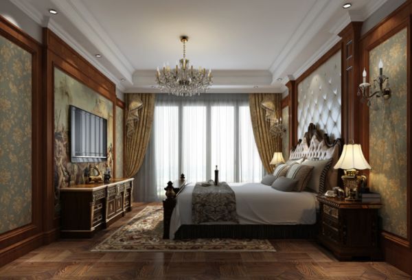 次卧用白色堆砌了女孩干净的梦,线条简洁的美式白色家具与白色墙融为一体,打造舒爽整洁的氛围。棕色地板,像巧克力一般甜蜜,闪闪发亮的水晶灯住着最美的梦。