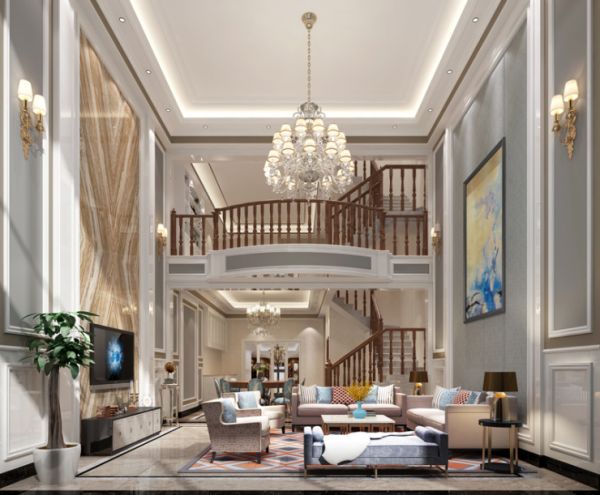 超高空间挑空客厅,更显大气和气派。垂落的水晶吊灯极大地弱化了空旷感。背景墙、地板以及沙发用低饱和色的色彩拉近了空间和人之间的距离。