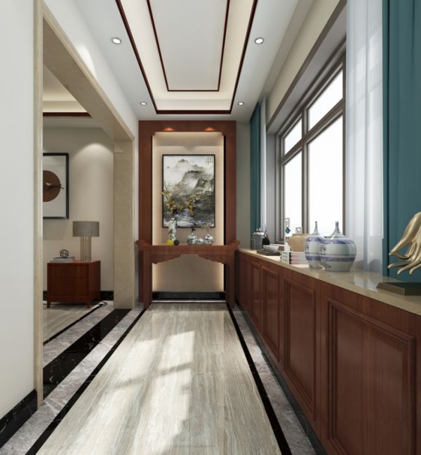 入宅过道笔直打通大门与客厅,清爽利落。通道尽头是一幅水墨山水画,古朴的青花瓷瓶和浅色插花让画中深深浅浅的山水更愈发朦胧,对未知的客厅更有了期待。