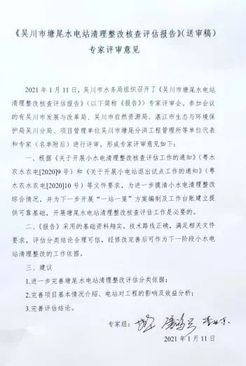 1月13日,吴川市水务局分别发布了《关于吴川市塘尾、大山江和樟铺积美水电站清理整改核查评估报告(报批稿)的公示》。