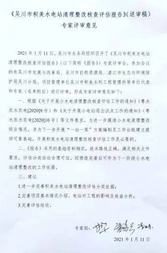 根据《广东省水利厅 广东省发展改革委 广东省生态环境厅 广东省林业局 广东省能源局关于开展小水电清理整改核查评估工作的通知》(粤水农水农电〔2020〕9号)文件有关规定,2021年1月11日已组织相关专家对吴川市塘尾、大山江和樟铺积美水电站清理整改核查评估报告文件进行技术评审,综合评估结论为将吴川市塘尾、大山江和樟铺积美水电站拟定为保留类水电站。