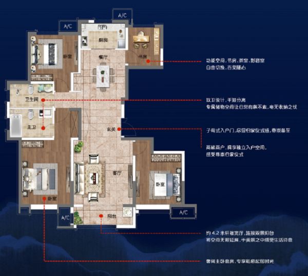 墅级阔景平层——147㎡全能四室户型,居室置于四角,后期改造更加灵活,可满足二胎时代、三代同堂的居住需求。超大的玄关空间,既满足收纳功能,也带来尊贵仪式感。南北约13.5米一字通厅,南向约4.2米宽厅,休憩、用餐、烹饪,家秉持功能化与舒适度的和谐统一。无限功能第四室,可在衣帽间、书房、影音室、健身房……之间自由切换,尽情演绎全家人妙趣横生的生活瞬间。