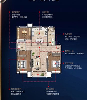 礼献大户家庭——143㎡朗阔三室户型,南北12.4米一字型等宽客餐厨,为休憩、用餐与烹饪划分专属区域,为室内营造了更加明亮通透的环境。两间居室和客厅均朝向为南,以三面宽迎接明媚日光和广域美景。主/次卫均为明卫设计,可全天候为浴室内带来更加清新的空气,次卫4.4米进深空间,保障了使用空间充裕而不局促。