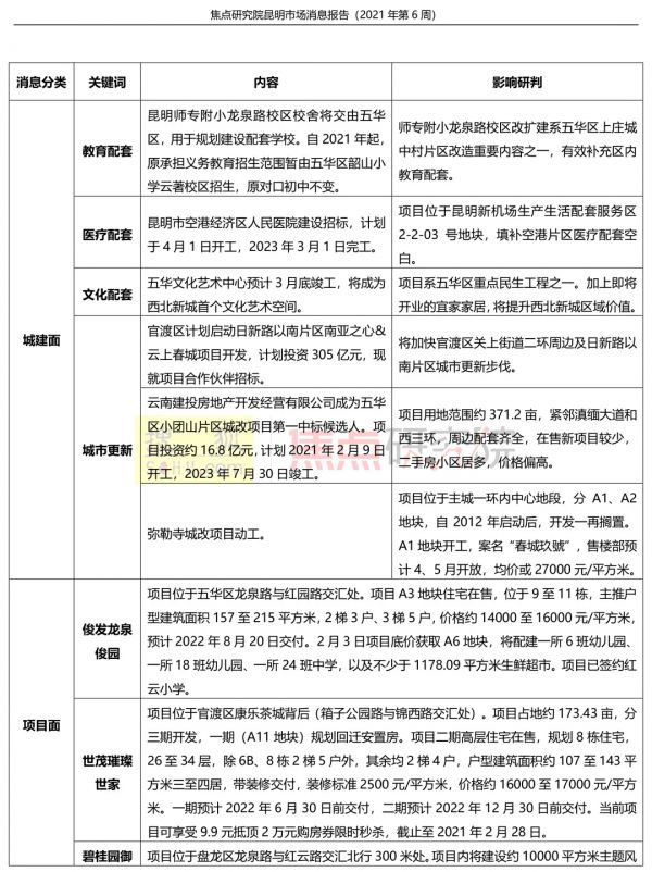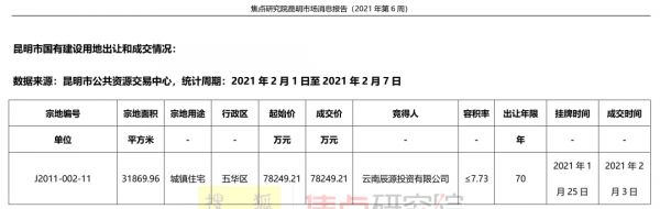 一级市场方面,当周昆明无商品房用地供应,当年主城首宗商品房地块成交,面积47.8亩,建筑面积24.64万平方米,为五华区红云街道城改项目地块,须建设5.2万平方米回迁安置房。地块最终由俊发旗下子公司底价获取,为俊发龙泉俊园项目A6地块,后续用地须配建3所学校,含2所幼儿园和一所中学。
