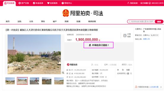 7月1日,广东省深圳市中级人民法院首次发布了《拍卖被执行人天津天房卓汇置业有限公司名下位于天津市南开区迎水道北侧的土地使用权的公告》,计划于8月3日10时至8月4日10时期间,在阿里法拍平台公开拍卖天房所持迎水道B地块土地使用权,起拍价19亿元。截至8月4日10时,2位报名竞买者均未报价,该轮拍卖以流拍黯然收场。