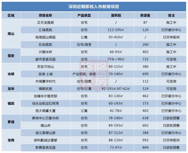 据老牛不完全统计,深圳近期潜在入市的新盘18个,因楼盘推盘的不确定因素,以下统计信息以开发商实际情况为准。