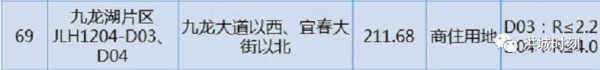 九龙湖片区JLH1204-D03、D04地块位于九龙大道以西、宜春大街以北,土地面积211.68亩,规划用途为商住用地,其中JLH1204-D03容积率2.2,JLH1204-D04容积率4,地块总计容面积约437474平方米。