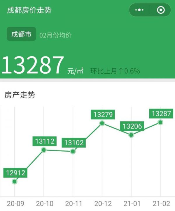 2021年2月,成都市的房价新鲜出炉,据成都房价走势显示,2月份的成都房价均价为13287元/平方米,环比1月份上涨0.6%。