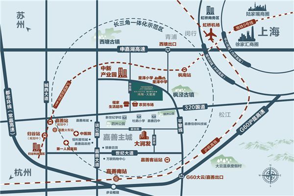嘉善位于中国长三角经济核心腹地,是江浙沪两省一市 的交汇处,是浙江接轨上海的第一站,是国家首批沿海对外 开放的县和全国农村综合实力百强县之一,在全国营商环境 百强县排名第36名。境内交通也十分的发达,距离上海虹桥 机场、浦东机场、萧山机场一个小时左右均可到达