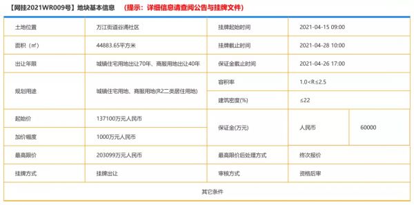 地块将采用“最高限价+终次报价”方式竞拍,最高限价为203099万元,折合楼面地价约为20697元/㎡。