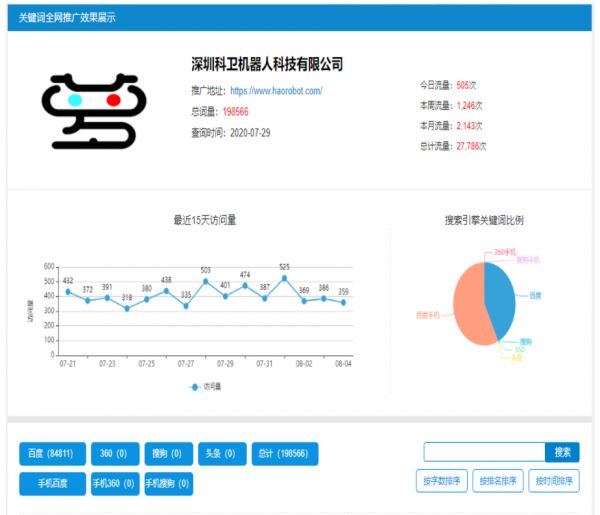 下面,以深圳科卫机器人科技有限公司为例。从图中可以看到,截至2020年7月29日,深圳科卫机器人科技有限公司的总词量高达198566个,当天流量为505词,总计流量高达27786次。在深圳科卫科技有限公司的案例中,乐云SEO万词霸屏为其设计的关键词中,可在百度搜索中排名前十。搜索引擎其实是精准营销的一种方式,是企业打开客户群体的重要方式。经过万词霸屏的推广,即可在短时间内达到超大的曝光量。