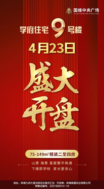 4月23日,国维中央广场爆款新品9号楼重磅来袭:建面约75-149㎡精装二至四房学府住宅,火热加推,再续经典!