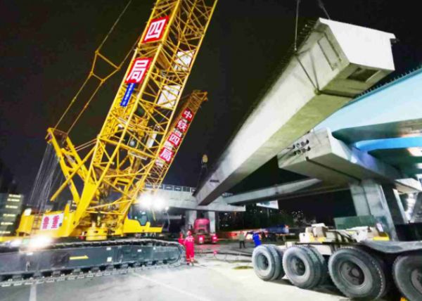 经过技术人员的监控测量,在两台大型吊装设备的默契配合下调整位置,预制箱梁经转身下放,平稳落在两榀指定盖梁之间。“目前,湿接缝作业、挡土墙施工、引桥段路基填筑、防撞护栏施工也在如火如荼地进行中,预计5月底完成预制箱梁湿接缝施工,6月上旬完成防撞护栏及桥面铺装施工。”中铁四局崇文大道项目经理陈志龙说。