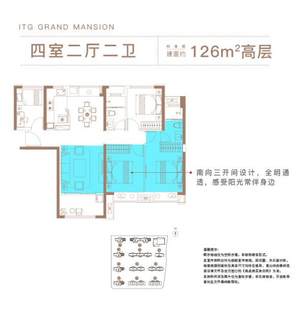 真正意义上做到南北通透,且三面朝南,全明设计(明厨/明房/明卫)的大四房。户型设计从业主的舒适度出发,实现空间利用率最大化,保证了生活该有的空间尺度。
