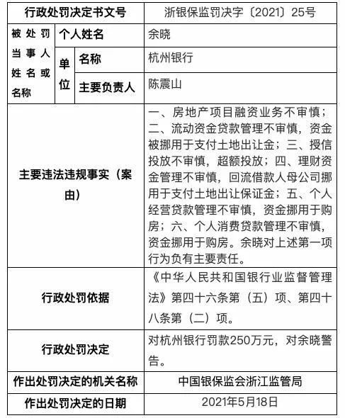 昨日,银保监会浙江监管局公布的行政处罚信息公开表显示,杭州银行存在房地产项目融资业务不审慎;流动资金贷款管理不审慎,资金被挪用于支付土地出让金;授信投放不审慎,超额投放;理财资金管理不审慎,回流借款人母公司挪用于支付土地出让保证金;个人经营贷消费贷管理不审慎,资金挪用于购房;个人消费贷款管理不审慎,资金挪用于购房等六大违法违规行为,被罚款250万元。