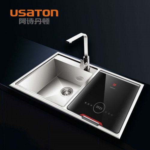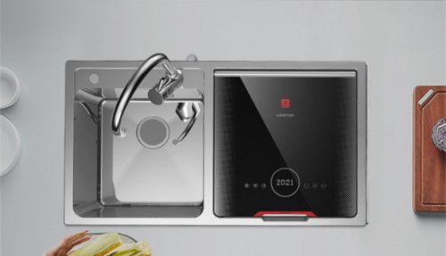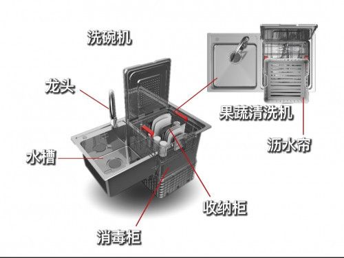 阿诗丹顿水槽洗碗机,整合了洗碗机、消毒柜、收纳柜、水槽、果蔬清洗机、龙头和沥水帘7项功能于一体。
