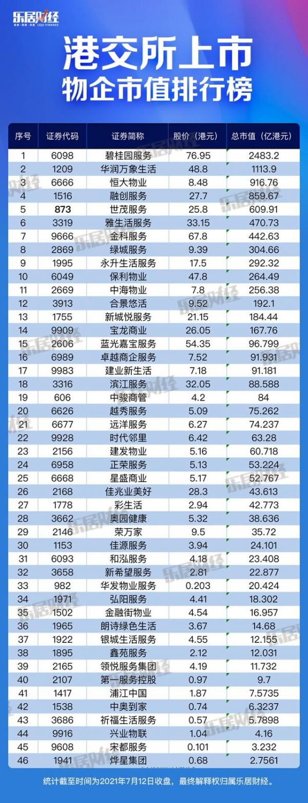 上市首日,领悦服务收盘报4.19港元,与发行价持平,总市值约11.73亿港元,在46家港股上市物企中位倒居第7位。