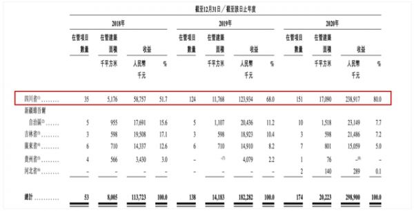招股书显示,截至2020年12月末,领悦服务在管项目数量合计174个,总在管面积为2022.3万平方米。其中,分布在四川省内的在管项目151个,在管面积1709万平方米,占总在管面积的84.5%。