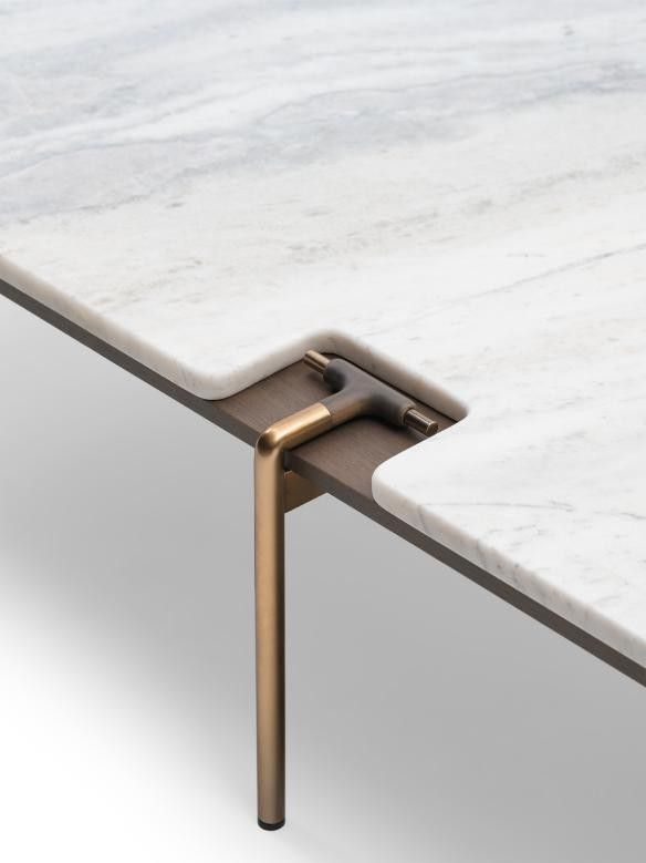 茶几系列设计延续简约轻松的风格,大理石、木材与金属自由搭配。桌面采用了纹理丰富的大理石,与桌脚形成独特的T字结构;黄铜金属和深色木材的碰撞,加以细节的处理,带来视觉上的轻盈明快感。电视柜有多种面料供选择,大大提高了个性定制的趣味性。