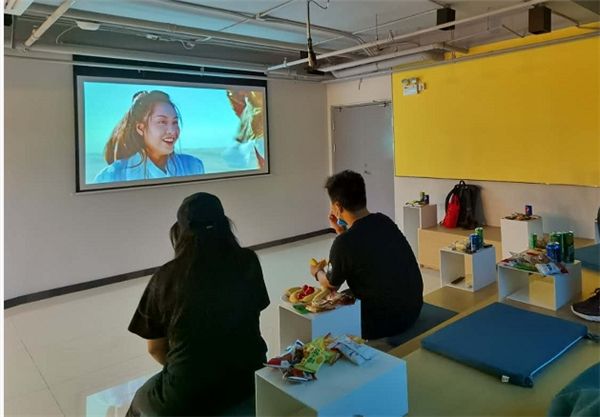 住客在魔方9号楼公寓公区观影