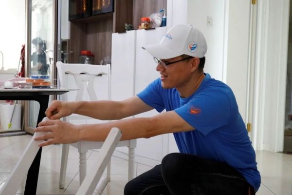 安装过程中,原来的全包脚垫已经耗损严重,贾工将其从椅子脚上卸除,进行全套的擦拭、清洁、粘贴、按压固定后完成安装。