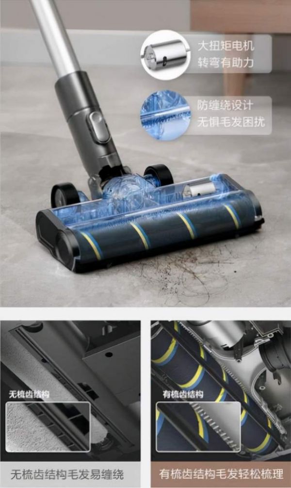针对清扫时毛发容易缠绕的痛点,美的还专门配置了防缠绕滚刷设计,采用防缠绕梳齿结构,边梳理毛发边吸尘,有效防止毛发缠绕,让用户无惧毛发困扰。同时,直驱大扭矩软绒地刷,能更好贴合地面,大大提升清洁效率。