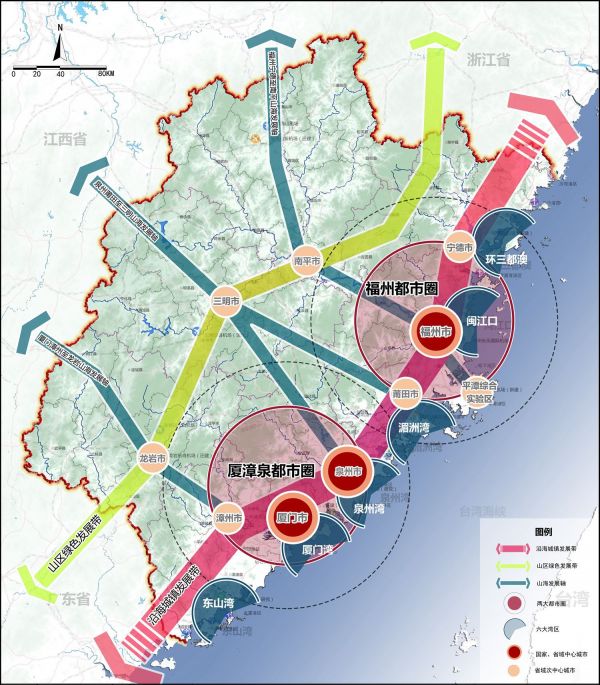 如赵燕菁分析,按山海关系看,沿海城镇发展带和山区绿色发展带分别串联起两组地理条件不同的城市,构成福建两条横轴;按江流关系看,沿九龙江、晋江和闽江三条江,分别形成从沿海厦门、泉州和福州三市出发,各自向内陆延伸的三个城市集团,并构成福建3条纵轴。