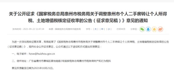 9月22日,国家税务总局惠州市税务局发布了关于《国家税务总局惠州市税务局关于调整惠州市个人二手房转让个人所得税、土地增值税核定征收率的公告(征求意见稿)》。