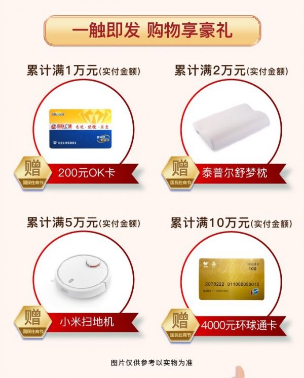 全场累计实付金额达到相应金额门槛后,可凭销货单到活动处领取相应礼品,200元OK卡、价值800元泰普尔舒梦枕、价值1470元的小米扫地机、最高领4000元环球通卡,数量有限领完为止。