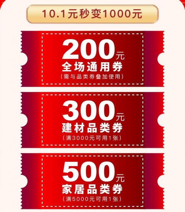用户花费10.1元可在月星线上平台购买价值1000元的月星品牌券包,其中包括200元全场通用券,300元建材品类券,500元家居品类券,置新家为您优惠叠加。