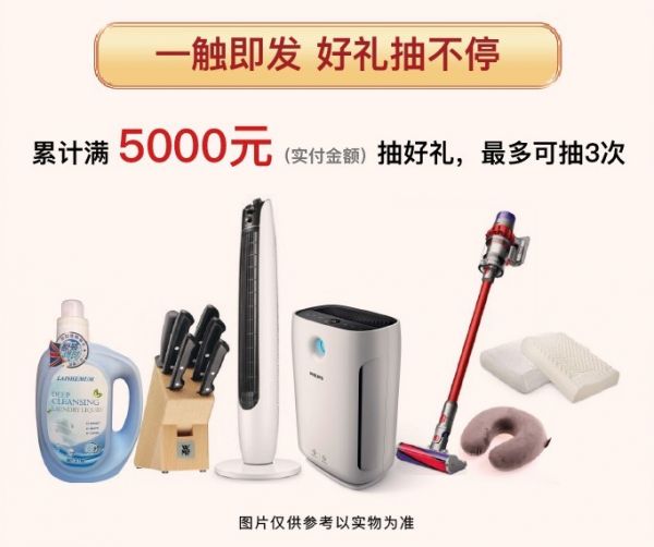 购物累计实付金额满5000元可凭销货单到活动处参加盲盒抽奖,单个顾客最多可抽3次;飞利浦空气净化器、梦百合乳胶枕、喜临门按摩器、价值3000元戴森洗尘器等,礼品数量有限送完为止。