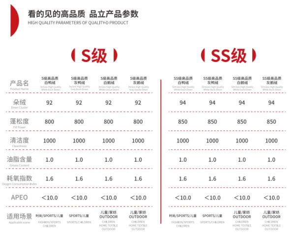 SS级羽绒又可分SS级高品质白鹅绒、SS级高品质白鸭绒、SS级高品质灰鹅绒和SS级高品质灰鸭绒,均能达到94%的朵绒,850+的高蓬松度。