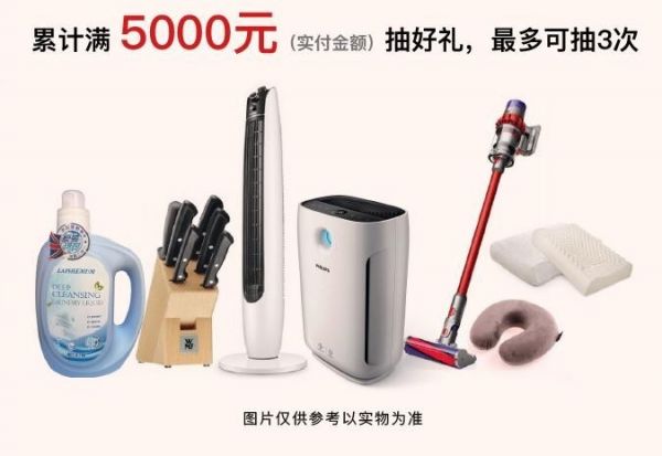 购物累计实付金额满5000元可凭销货单到活动处参加盲盒抽奖,单个顾客最多可抽3次;飞利浦空气净化器、梦百合乳胶枕、喜临门按摩器、价值3000元戴森洗尘器等,礼品数量有限送完为止。