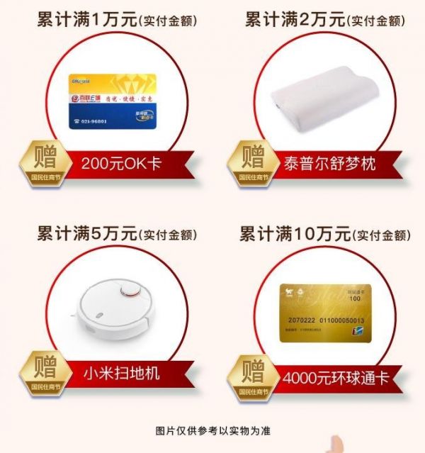 全场累计实付金额达到相应金额门槛后,可凭销货单到活动处领取相应礼品,200元OK卡、价值800元泰普尔舒梦枕、价值1470元的小米扫地机、最高领4000元环球通卡,数量有限领完为止。