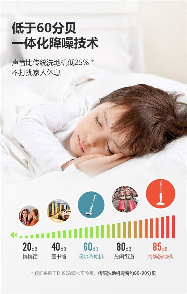 其次滴水洗地机使用过程中全程无废气排放而且噪音还低,滴水洗地机采用的是“水尘环流”技术,不需要高功率带动,因此功率只有36w,加上2500mAh的电池容量,续航时间可达60分钟。家里如果有宝宝的使用电器噪音问题要注意了,滴水洗地机的噪音在60分贝左右,而长期处于70分贝以上的环境下会对宝宝的听力造成不可逆的影响。