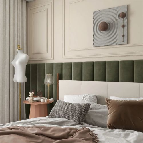 穿过过道便是Jessica的卧室,和客厅的色调风格很像,新加入了绿色的元素,让卧室显得更活泼。仔细看会发现一些别致的装饰品。角落的金边模特架、造型别致的透明床头灯、水纹的装饰画、黑色透明小熊玩具等,显现Jessica小女人的精致一面。