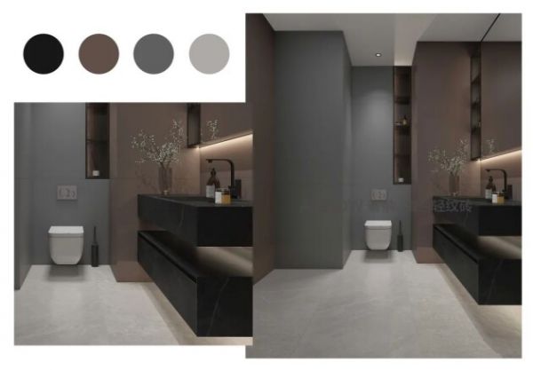 舒适高级的灰色调与咖色混合搭配应用,互相给卫生间增色。砖面细腻柔滑,具有肌肤般的质感,减少了藏污纳垢的可能,保持了一份空间的整洁干净。