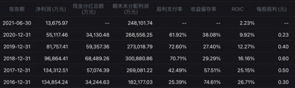 自1994年上市至今,该公司累计现金分红25.95亿元。其中,2016年至2020年,依次分红为3.42亿元、5.71亿元、6.85亿元、5.94亿元、3.41亿元;分别占该公司当期归母净利润的25.36%、42.52%、70.69%、72.59%、61.89%。