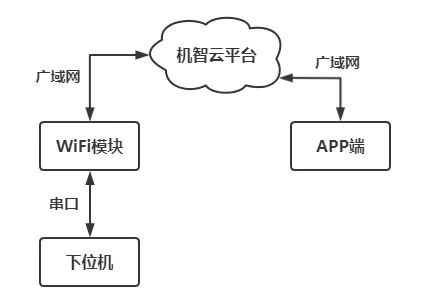 本系统在运行时,下位机设备控制端利用串口通过 WiFi 模块与外界通信,机智云开发平台作为数据中转中心,WiFi 和云平台利用广域网通过云端平台进行通信。