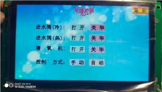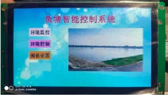 主界面主要是为用户提供一个功能导航页面,根据用户当时的需要来选择要进入的界面,可用作设备异常时进行显示和报警,还可通过实时监控界面查看当前鱼塘环境的实时参数;控制界面可以对外围设备进行直接控制。
