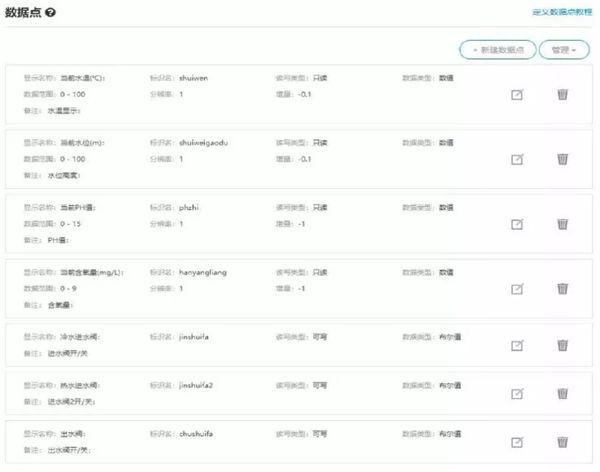 账号登录后,进入到机智云开发者中心,点击开发一个新的产品,在里面根据自己项目需要新建数据点,项目的云平台数据点如图所示;
