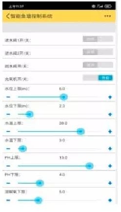 从主界面进入到控制界面,在控制界面可以对调节环境的外围硬件设备进行手动的方式控制或者设置自动控制;同时可以联合阈值设定,对各种环境变量进行控制,更加方面快捷的对鱼塘环境因子做出最敏捷的反馈,实现鱼塘环境控制控制的自动化,阈值设定界面如图所示。