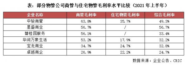 二是,商管毛利率水平更高,对物管公司整体盈利能力起到拉升作用。可以看到,2021年上半年中骏商管的商业物业管理及运营服务业务的毛利率高达63.8%,高出住宅物业管理服务业务28.1个百分点。星盛商业、碧桂园服务、华润万象生活的商管毛利率也都超过50%,展现出高收益性特征。卓越商企的商管业务综合毛利率相较偏低,为26.9%,主要原因在于卓越商企的商管业务主要来自母公司卓越集团和第三方物业开发商,其中来自母公司卓越集团的商管业务毛利率处在高位,达47.9%,但来自第三方物业开发商的商管业务毛利率仅为14.3%,拉低了整体水平。
