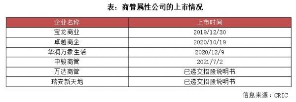 今年以来,商管赛道布局呈现明显的加速迹象。一方面,商管属性公司相继布局上市。继1月26日,星河控股旗下商业运营及管理公司星盛商业在港成功上市,7月2日中骏商管也挂牌上市,中骏商管是中骏集团旗下以商业物业管理服务为主导的服务提供商,凸显“商管”定位。截至目前,商管属性上市公司共有4家,此外瑞安新天地、万达商管也相继递交招股说明书,加速推进上市进程。