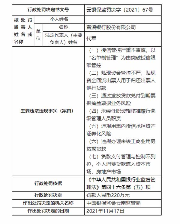 11月25日,中国银保监会云南监管局发布行政处罚信息公开表,富滇银行股份有限公司因贷款支付管理与控制不到位,个人消费贷款流入资本市场、房地产市场;违规办理未竣工商业用房按揭贷款等被罚220万元。